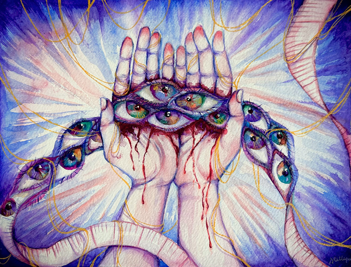 watercolor, watercolor pencil, gold acrylic, white gel pen on watercolor paper