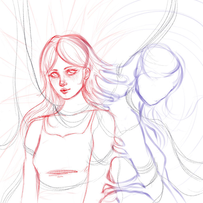 The personification of bipolar disorder. Mania in red, Depression in blue, complementary colors interwoven by the gold lines. Uncomfortably situated beside one another, yet impossible to extricate.